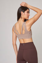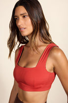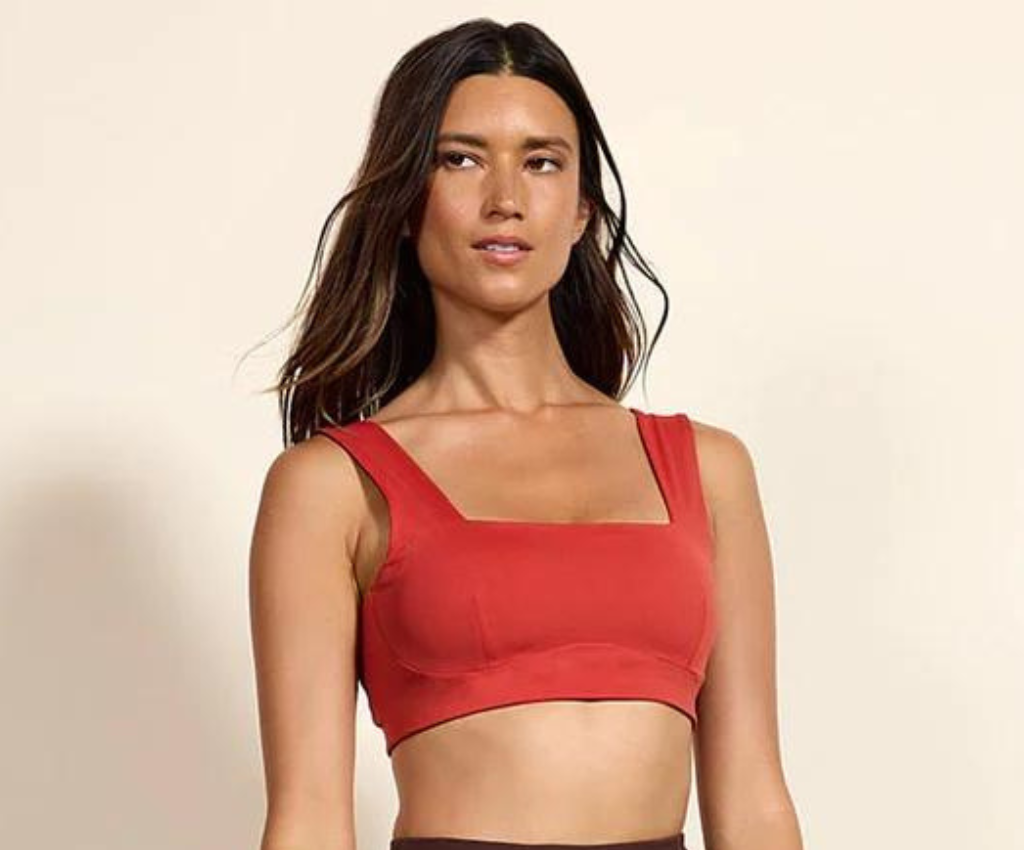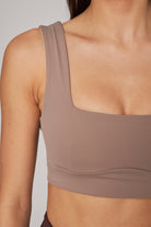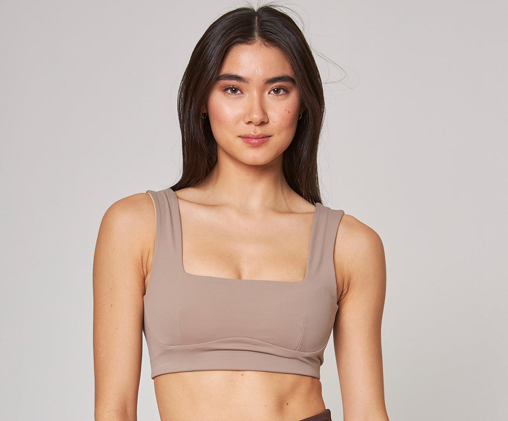 This MPG square neck sports bra has medium support in a compressive sleek fabric. It features a square neck line, wide straps with additional back straps for extra support, built-in-bra with removable bra pads, under bust seam and bust darts details. This sustainable top is made from recycled materials and is moisture wicking and quick drying. Perfect for dance auditions, conventions, photoshoots, yoga class and other workouts.