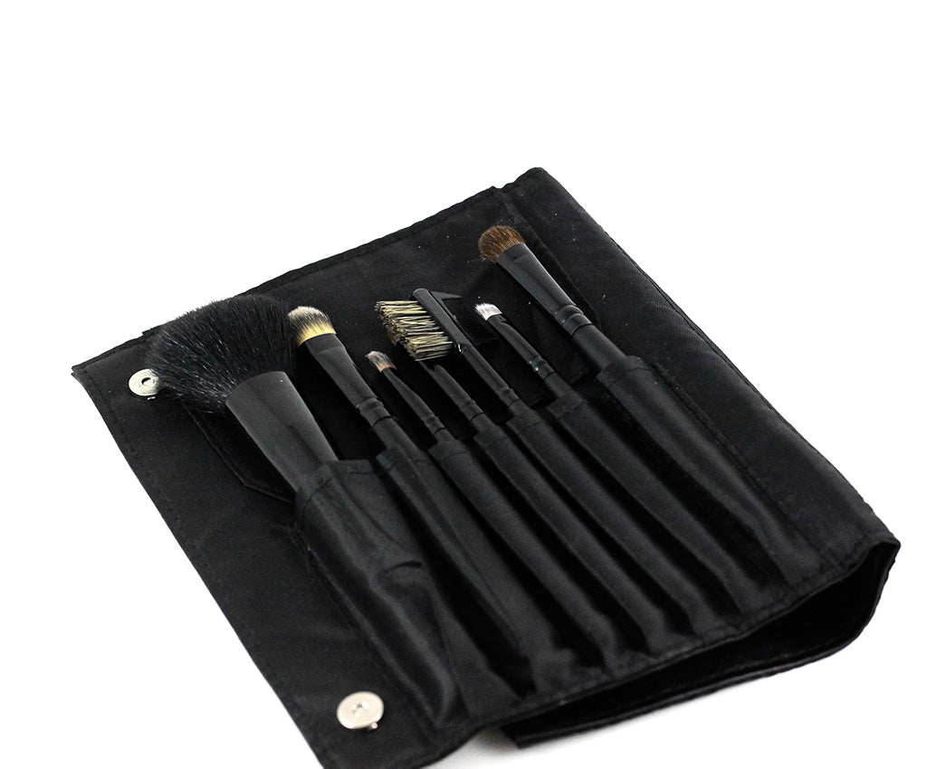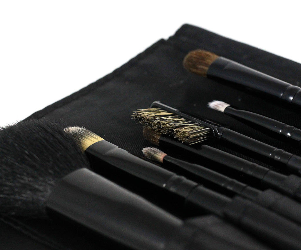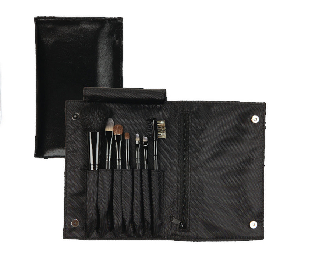 The case sports a soft faux leather outside and washable nylon inside. Includes individual pockets for each brush and a nylon flap to keep them dust free. Inside zipper pocket to store some makeup and double snap closure keep everything secure and clean.