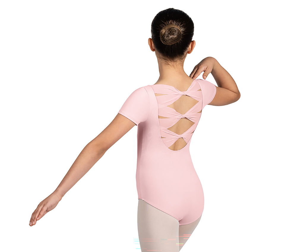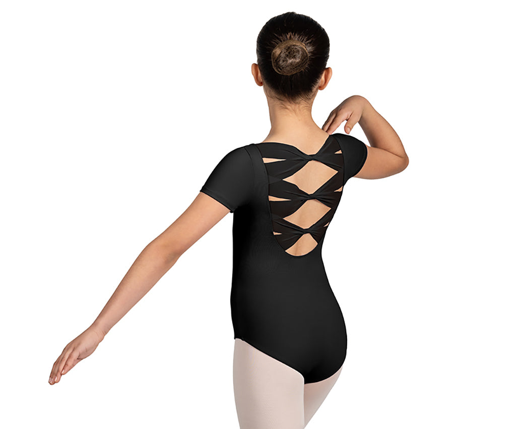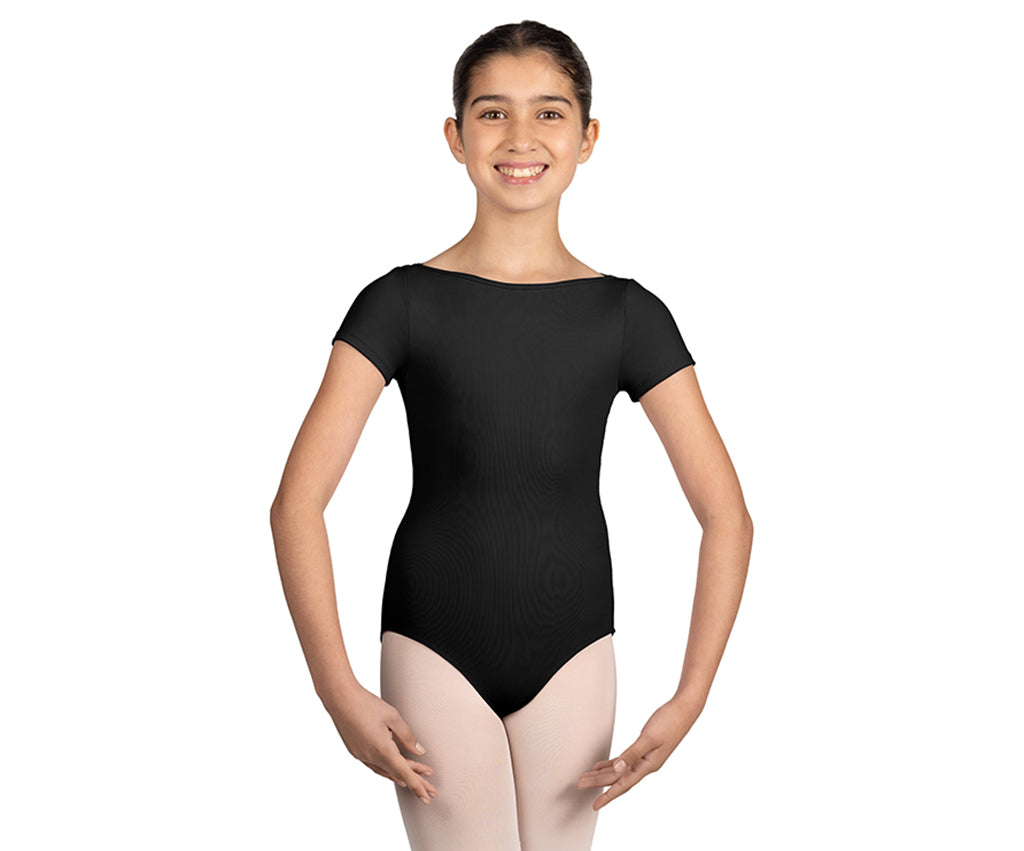 The Glow Girl Cap Sleeve Leotard from Mirella features a boat neck with cap sleeves and soft mesh twist back detail.