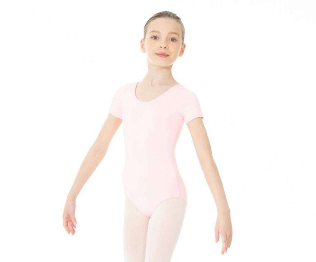 Simple essential dance leotard for ballet class. The short sleeve provides a bit of warmth and coverage. Fully lined front.