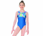 This Mondor gymnastic leotard has a solid colour leotard on the bottom and a colourful printed yoke and bright piping. Basic tank style shoulder with a scoop neckline and a regular cut leg line. Sorbtek gusset lining.