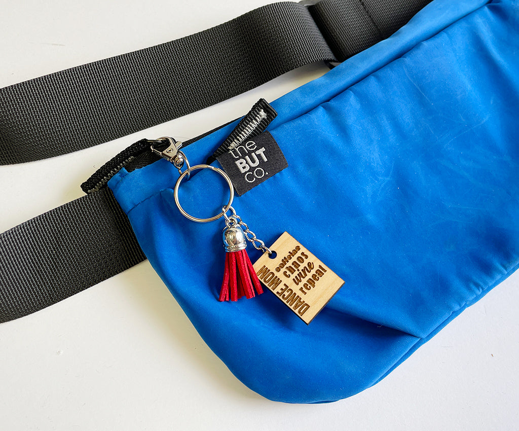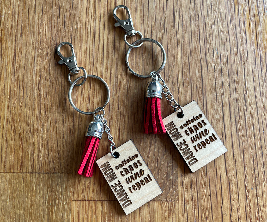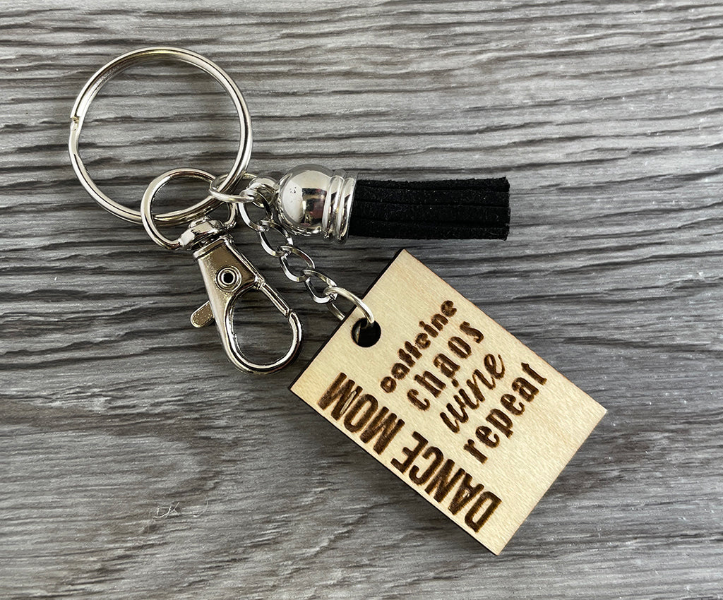 For all those dance mom's who are all-in with the dance mom life. This keychain is Handcrafted from solid Canadian wood and engraved with 'Dance Mom, Caffeine, Chaos, Wine, Repeat'. Attached to a key ring with a silver chain and finished with a carabiner lobster clasp and a fun suede tassel.