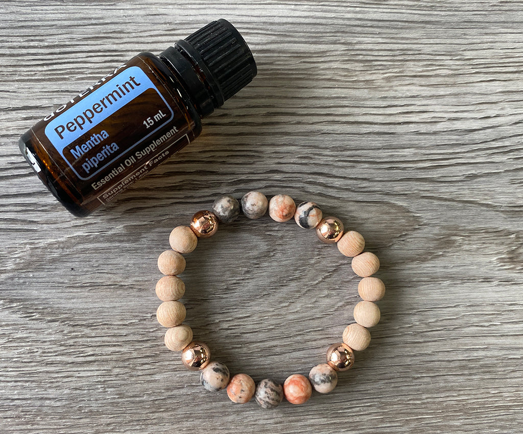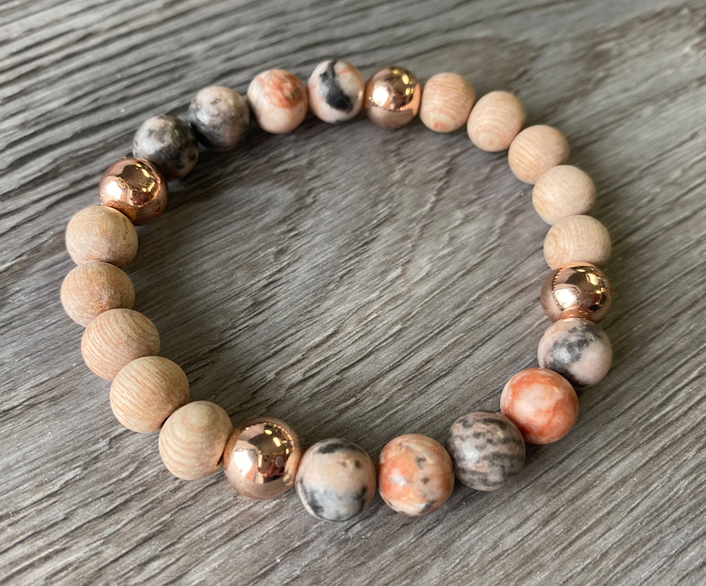 The mix of colours in the 8mm pink zebra jasper beads in this bracelet are vibrant and tranquil at the same time. Accented with 8 mm gold electroplated hematite beads for a simple touch. Completed with 8 mm raw rosewood beads you can add some essential oils to, and bring some balance and harmony to your day.