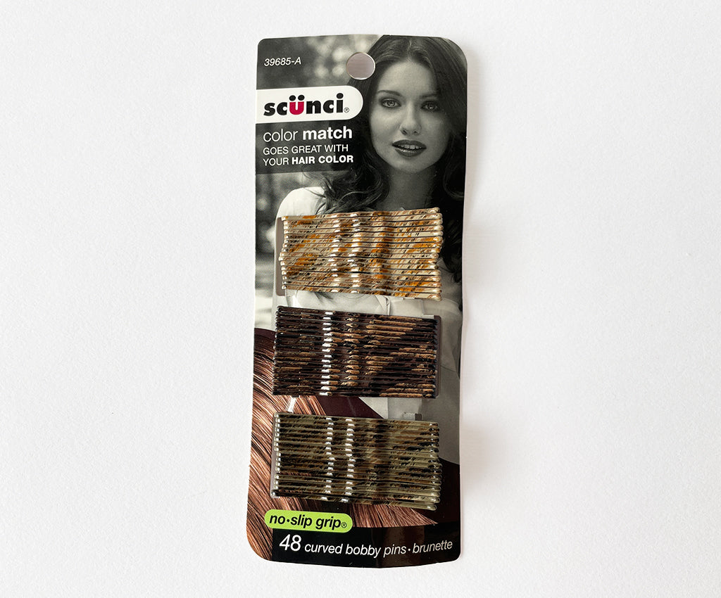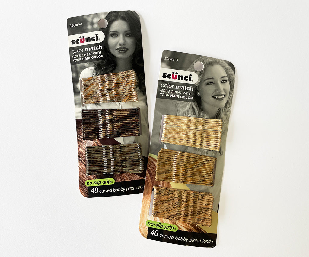 These Scunci bobby pins are curved for a no slip grip on hair. They are also designed to colour match with 48 pins in 3 shades to match hair colour variations. Two colour choices - Brown or Blonde blends.