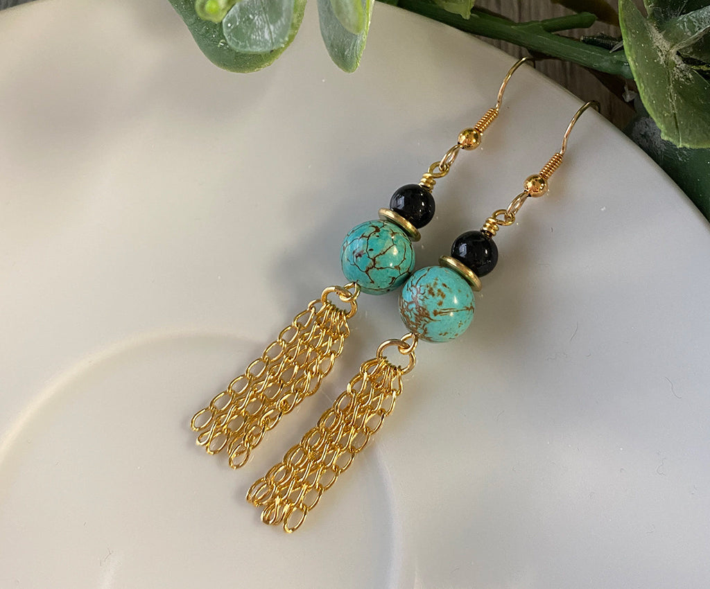 Bold yet classy, these dangles make a statement with natural turquoise and black agate stones. Gold plated findings and chain tassel make for a classic look. Matches perfectly to our Turquoise Eclipse Aromatherapy stretch bracelet. Dangle length is approximately 2 3/4”