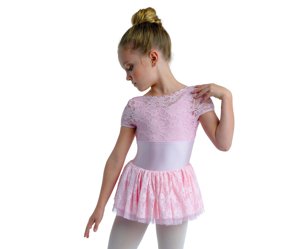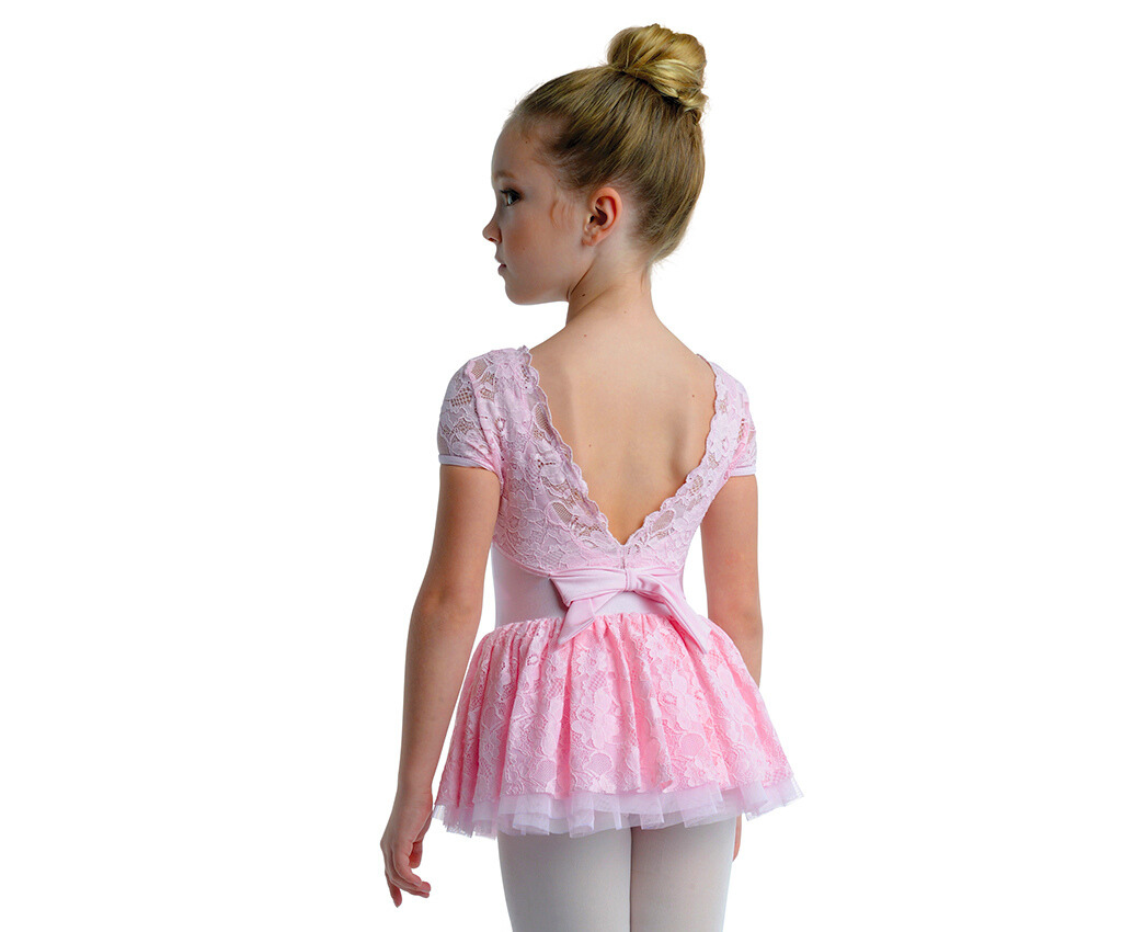 The Danznmotion Clara Dress features an attached layered "tutu" skirt, cap length lace sleeves with a scalloped lace ballet neckline and low "V" back detailing. This stunning kids' dress boasts a multi-tier skirt with lace as the top layer and mesh for the bottom two. For a sweet finish, an added bow is on the center back. Fully front lined.