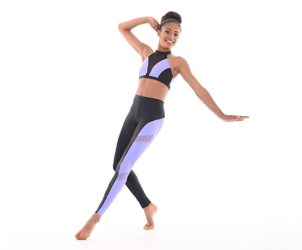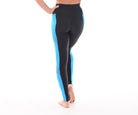 Contemporary, stylish and amazingly comfortable these MOD exclusive leggings in high quality breathable & UV treated black matte Italian spandex are so flattering with their curved contrasting coloured lycra side panel.  Sheer matching stretchy mesh angled inserts add some flare to these great fitting leggings.   With a wrapped elastic 2 inch waistband for security and professionally finished standard length hem these can be washed and worn again and again. A versatile must have to pair with any of the Convention or other Collection tops to wear at conventions, in class, at the gym, on stage or just for fun.