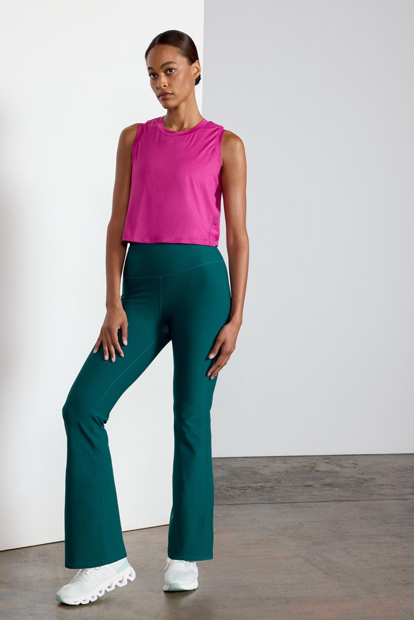 These MPG Explore High-Rise Boot Cut Pant are the perfect flared legging! Super comfortable and luxurious feeling. They feature anti-chafing flatlock stitching, a hidden pocket the front waistband, and the perfect flare. Made from a moisture wicking, quick drying, recycled material that is great for the gym, yoga, teaching dance, coaching, or just wearing on the go!
