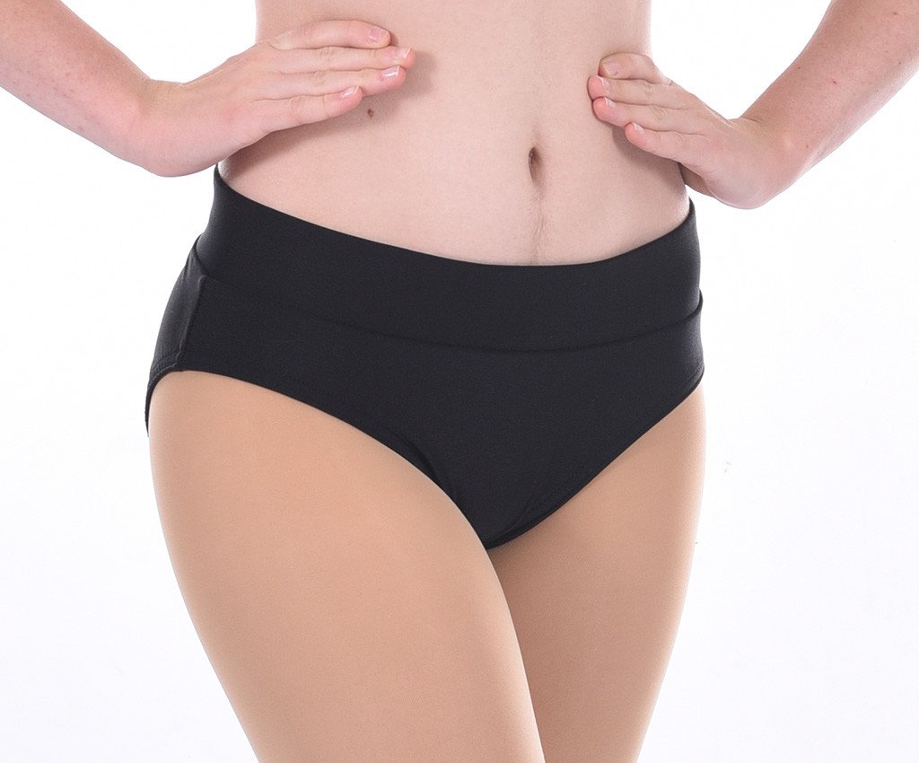 Our MOD brand basic dance brief is made in black supplex or lycra has a 2 inch elastic or fabric waistband with elastic finished legs. Regular rise and lined front, this is the perfectly simple bottom.
