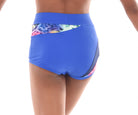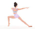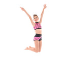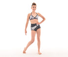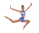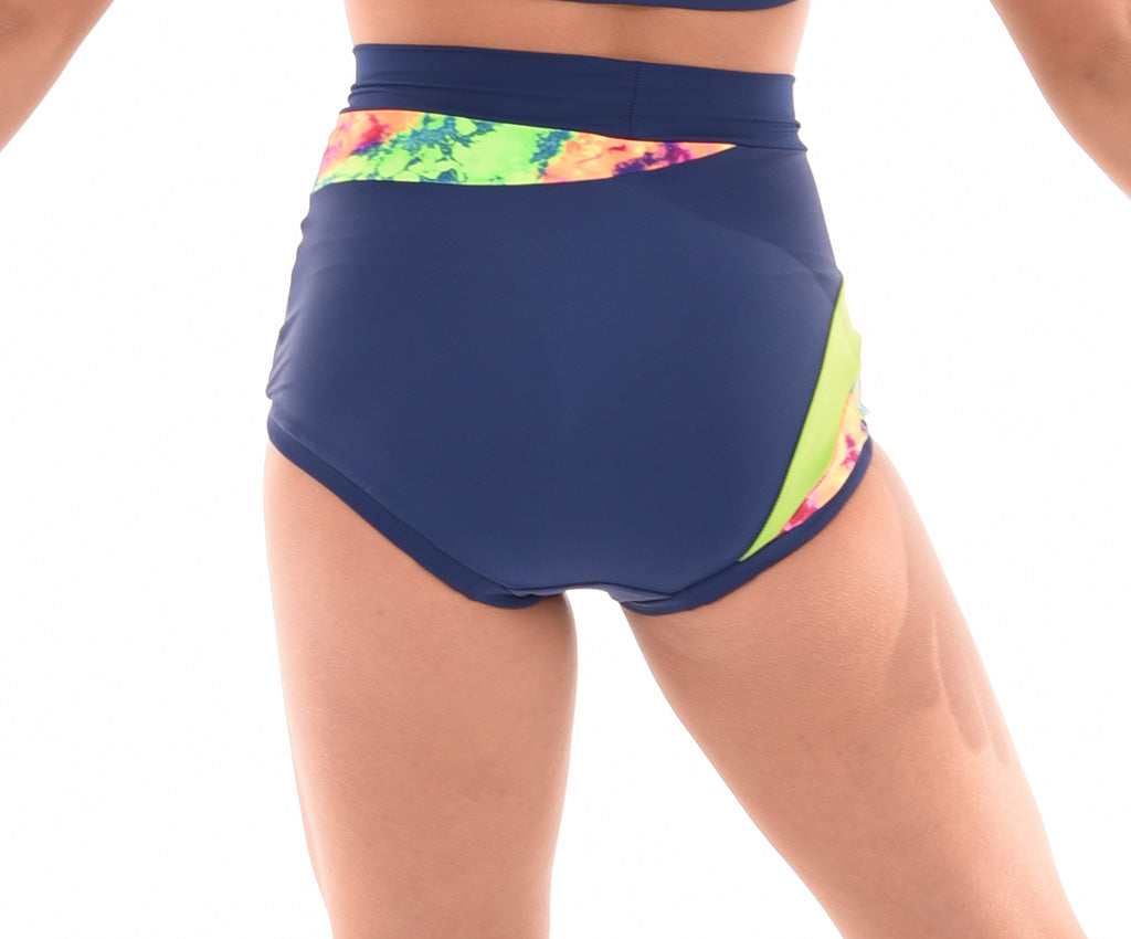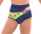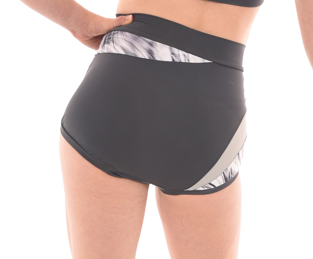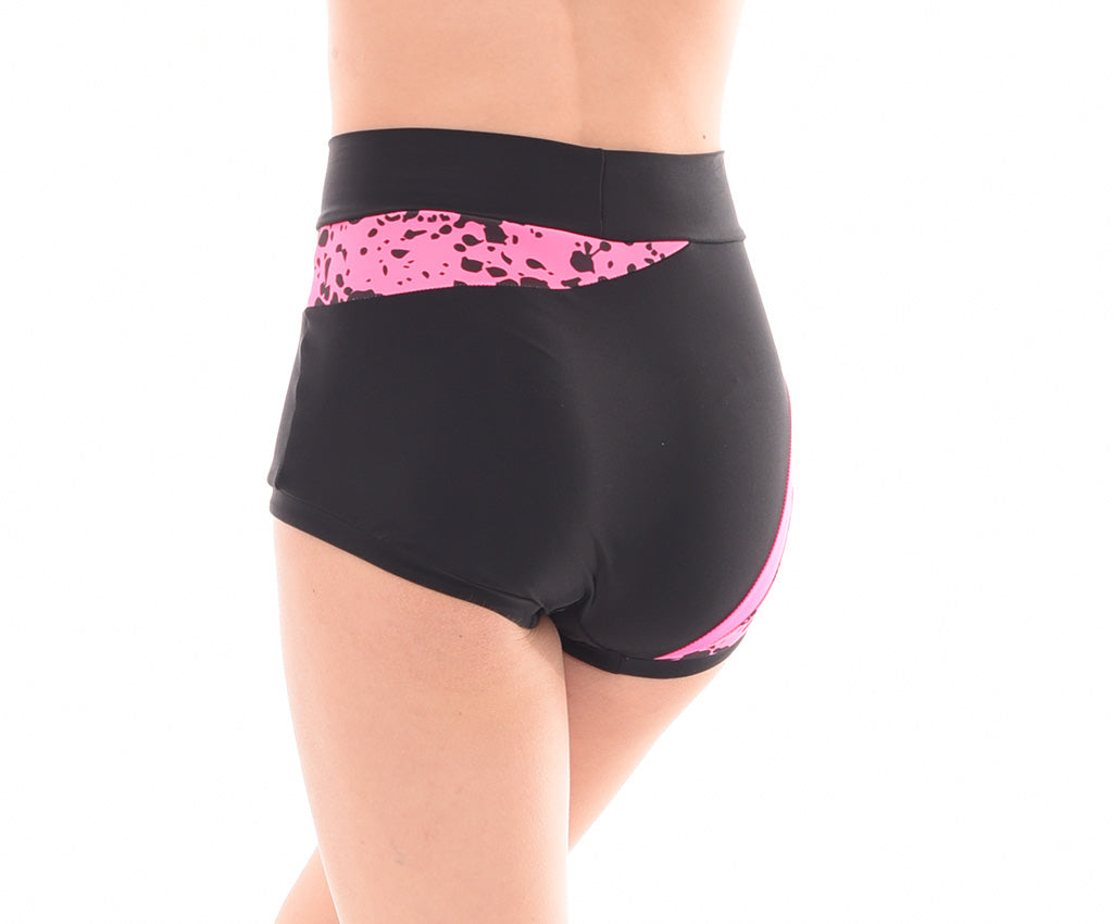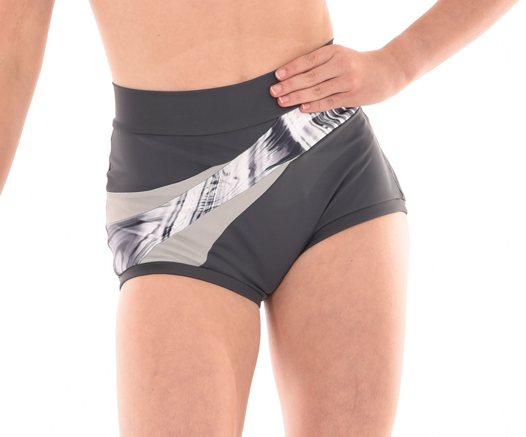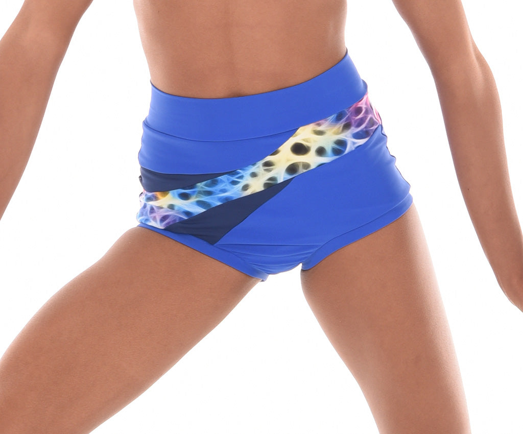 MOD design. These stylish shorts of solid coloured Italian Lycra feature an asymmetric design with a high quality print fabric panel extending from front to back. Accent fabric inserts edge the print to bring out the interesting design of this short. With lined front and wrapped elastic legbands they are the perfect in between length and stay  put during any dance move.