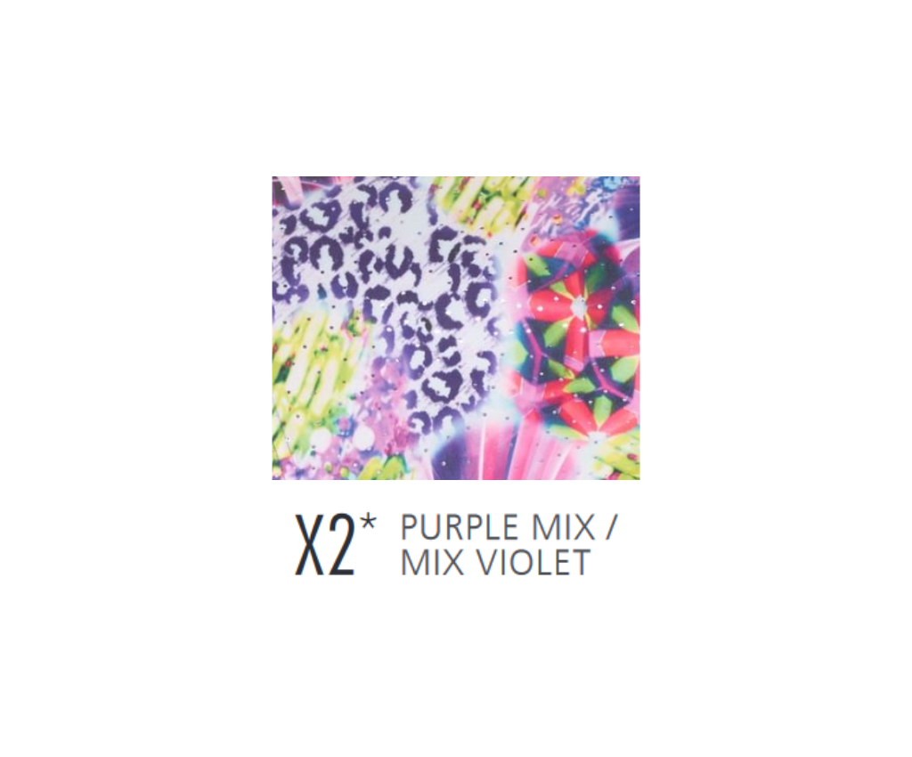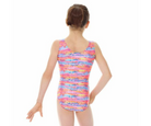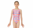 This Mondor printed gymnastic leotard has an all over metallic foil print fabric with bright fun colours. Basic tank style shoulder with a scoop neckline and a regular cut leg line. Sorbtek gusset lining.