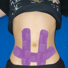 STEP 3: Take the last piece of tape and peel the backing off the middle. Use the middle as the anchor and place on your lower abdomen between the other two strips. Stretch one side of the tape across the abdomen and stick, repeat on the other side. The stretch should to be tight enough to feel like the tape is supporting the skin.