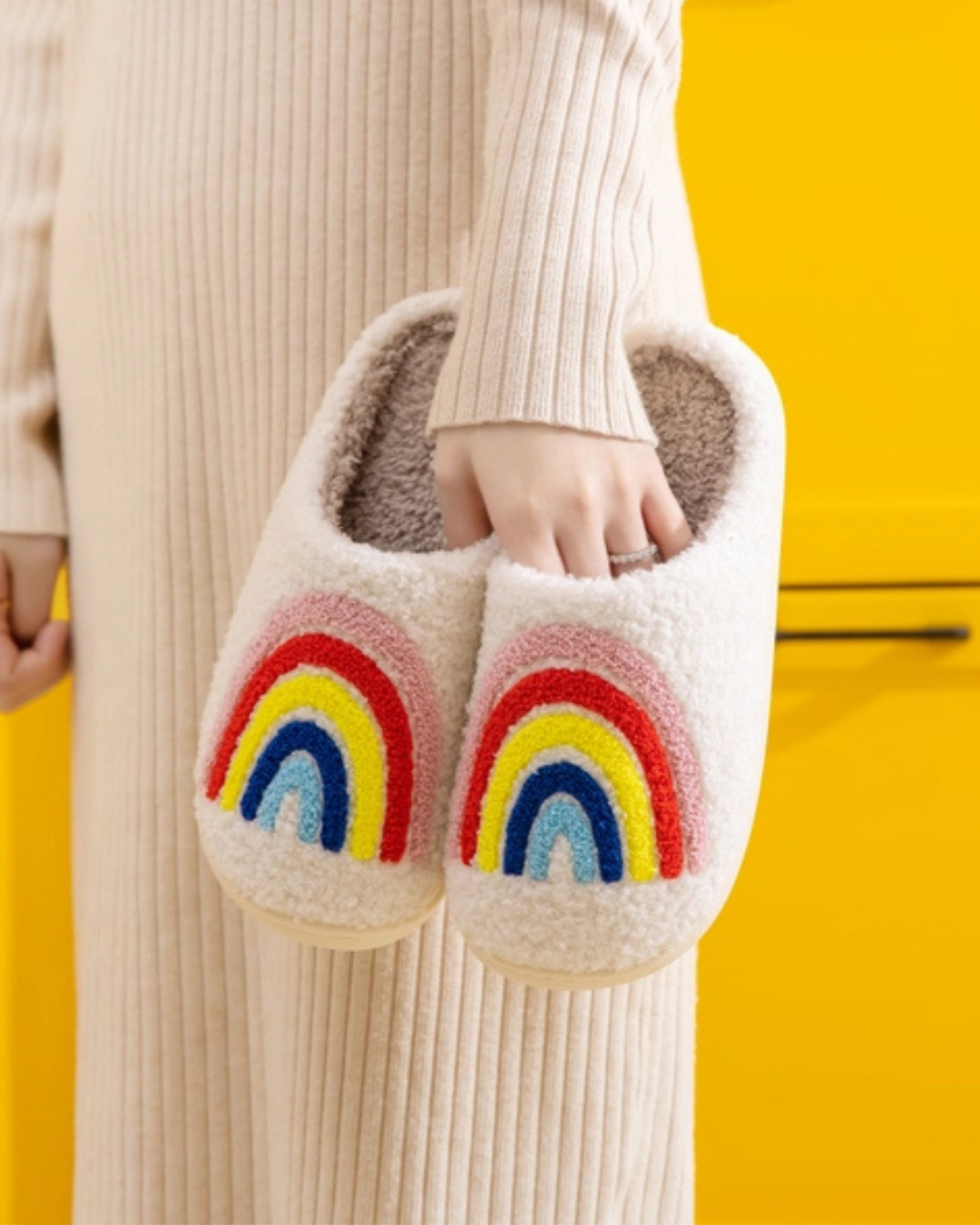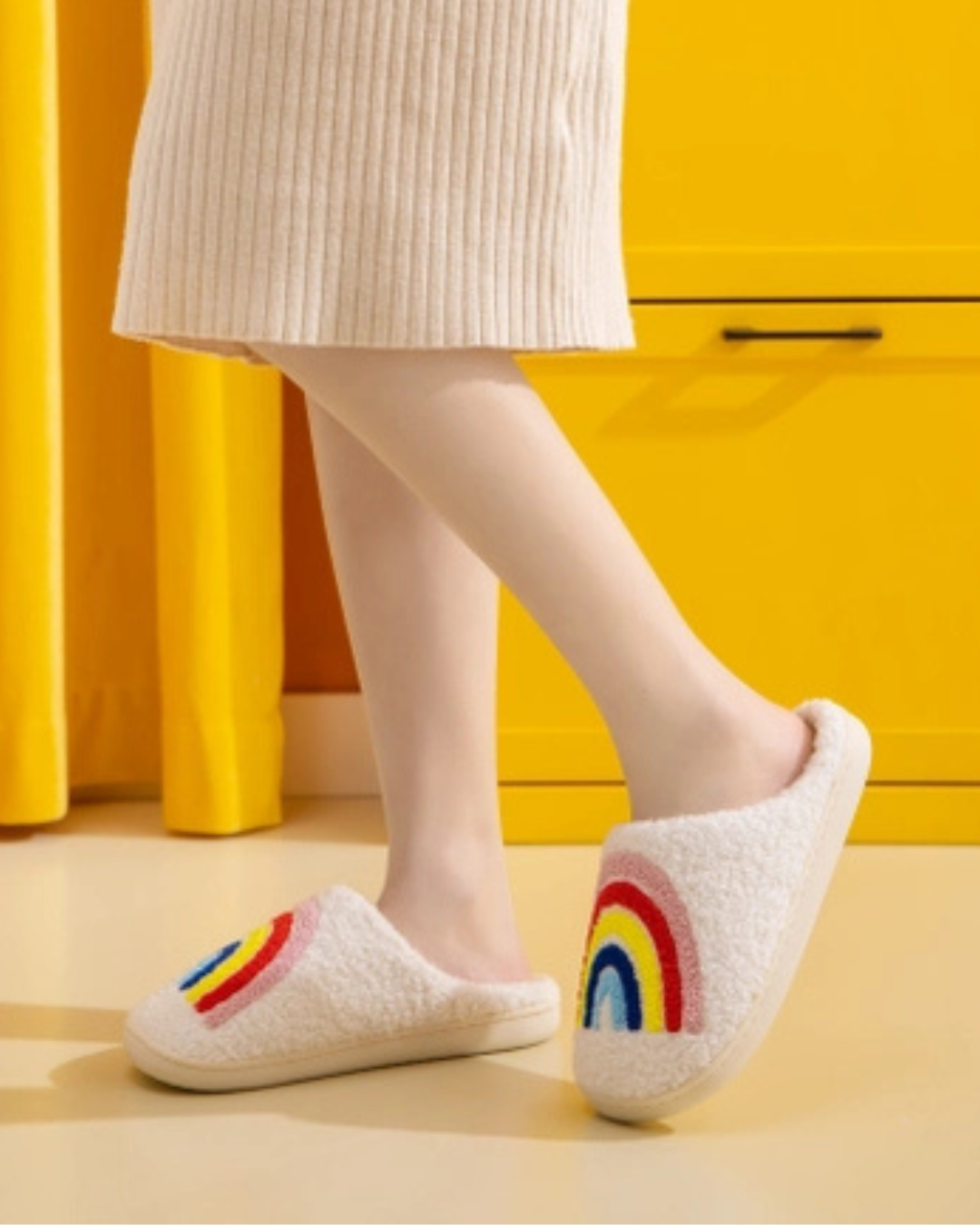 Trendy and stylish rainbow illustration casual slipper! Keep your feet warm from cold weather with this faux fluffy fur slider. The lightweight, anti-slip rubber sole and fluffy soft fur inside the slipper will make you feel like you're walking on a cloud. High durability and stability and wearable in various occasions in both indoor and outdoor such as lounging, shopping, grabbing a mail, or walking the dog.