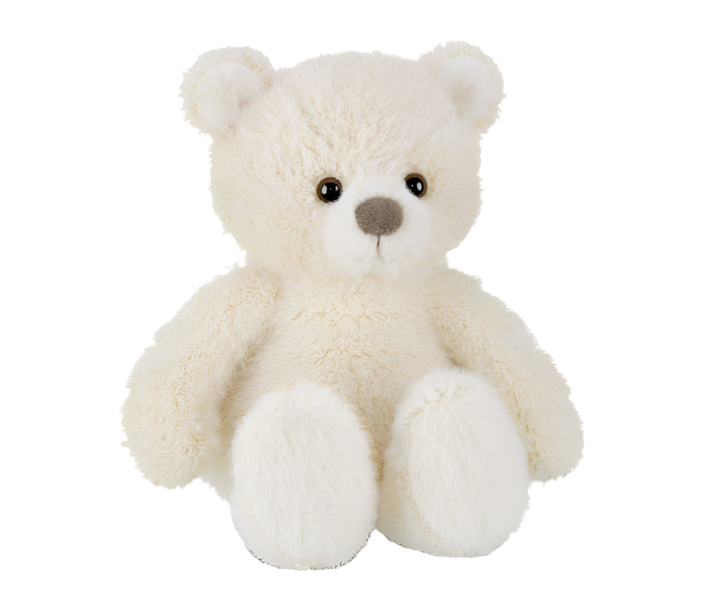 Classically cute 12" tall plush toy stuffed animal teddy bear with scruffy off white fur, hand fuzzy nose, and sparkling eyes. This plush bear's bottom is lightly weighted with a child safe inner bean bag making it extra cuddly and huggable.