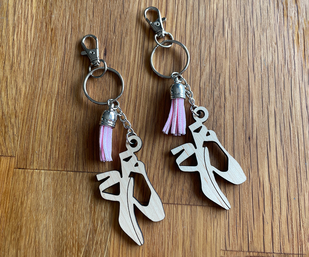Show off your love for dance with these Rhythm Jewellery keychains. Handcrafted from solid Canadian wood and cut in the shape of a pair of pointe shoes. Attached to a key ring with a silver chain and finished with a carabiner lobster clasp and a fun suede tassel.