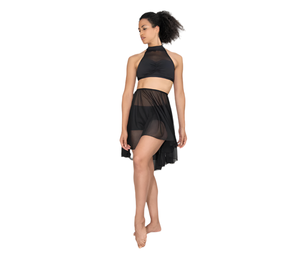 Simple but eye catching skirt for dancers. This "Hi-low" pull-on skirt features a matching fold-over elastic “in-position” waistband. Perfect for costuming solos or large group numbers!