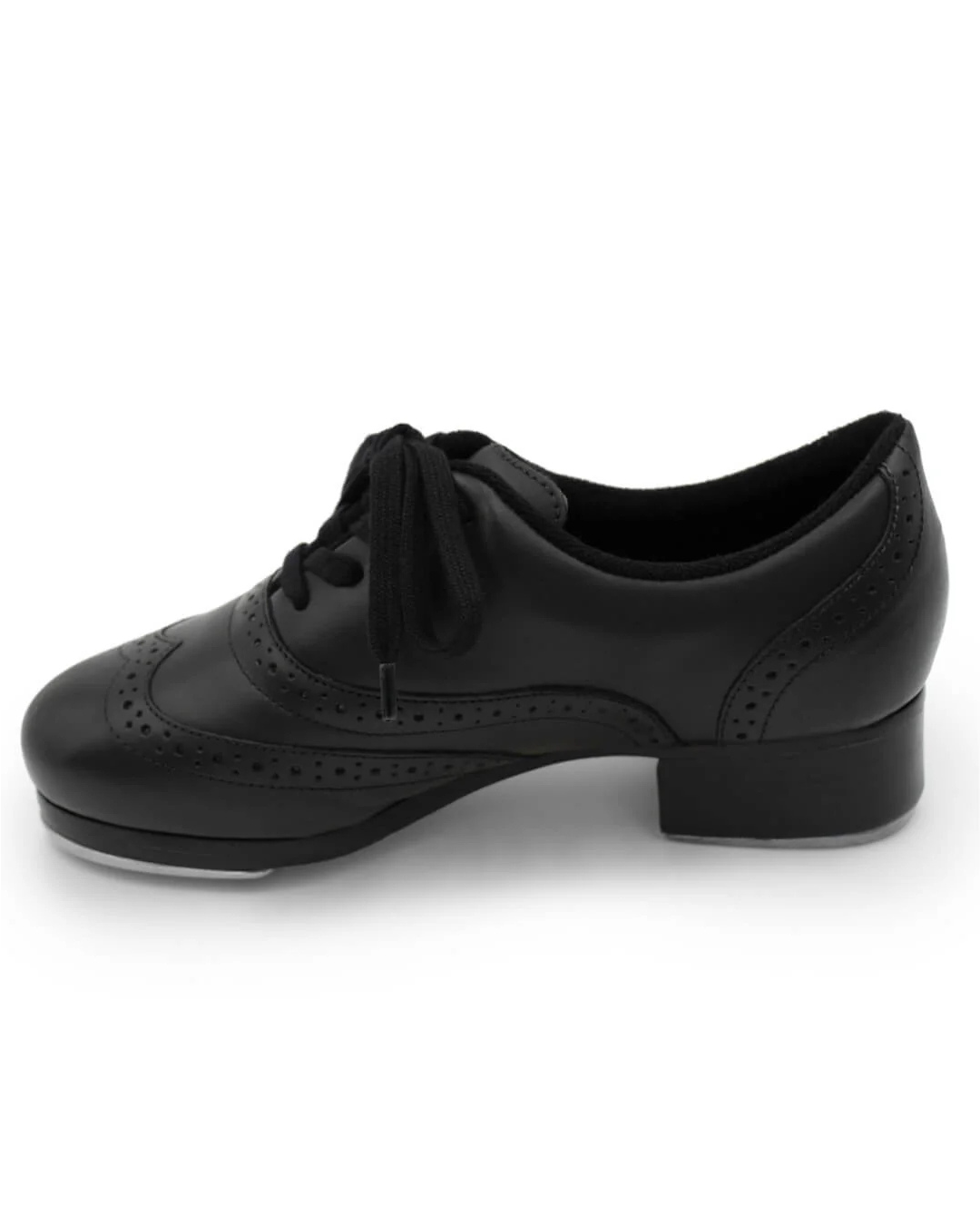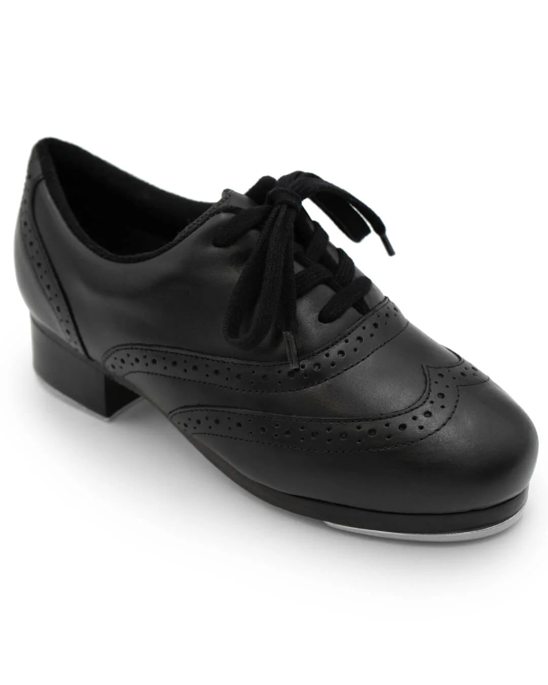 Revamp your look in the Roxy Tap Shoe. Features a soft, mold to the foot, Brazilian leather and designed with a traditional wing tip for style. Secure for toe stands, the toe box has a medium reinforcement and offers less restriction on the flex point. Double layer genuine leather sole is stitch on for added security. Capezio's signature Tele Tone® toe and heel taps are flush mounted for a trademark sound that begs to be heard.