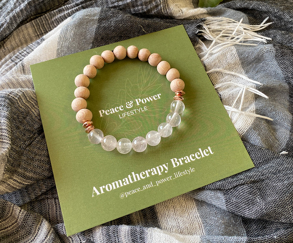 For aromatherapy add 1-2 drops of your favourite essential oil to the wooden beads over a paper towel. Wait for the oils to absorb into the beads before wearing. Reapply once the scent wears off.