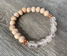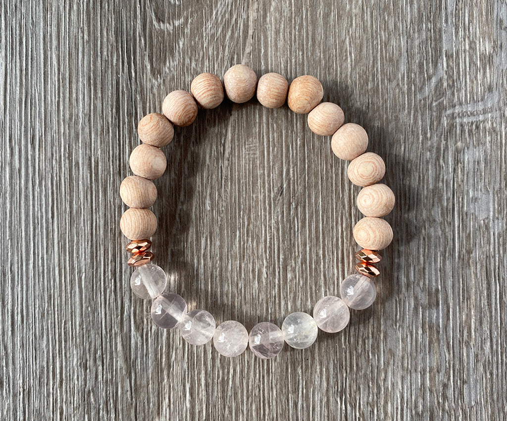 Simple and neutral this bracelet features 8mm raw matte rosewood beads, handmade by a family from the Philippians. Highlighted by 8mm natural rose quartz stones and accented with faceted rose gold electroplated hematite spacer beads. Beautiful on its own or can be stacked with other bracelets.