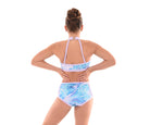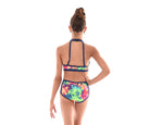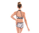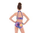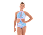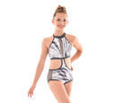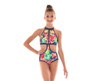 This MOD brand leotard features a flattering raglan cut bodice with a coloured mesh peek-a-boo insert. Top has a full back band and angled straps for a secure fit. MOD's signature no ride up short bottoms include side mesh panels and join the top in the front. Finished with coordinating solid binding. Front bust and short lining.