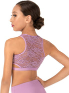 - Tank lace back bra has side cut-outs, covered elastic torso band and features a memory stretch front lining.