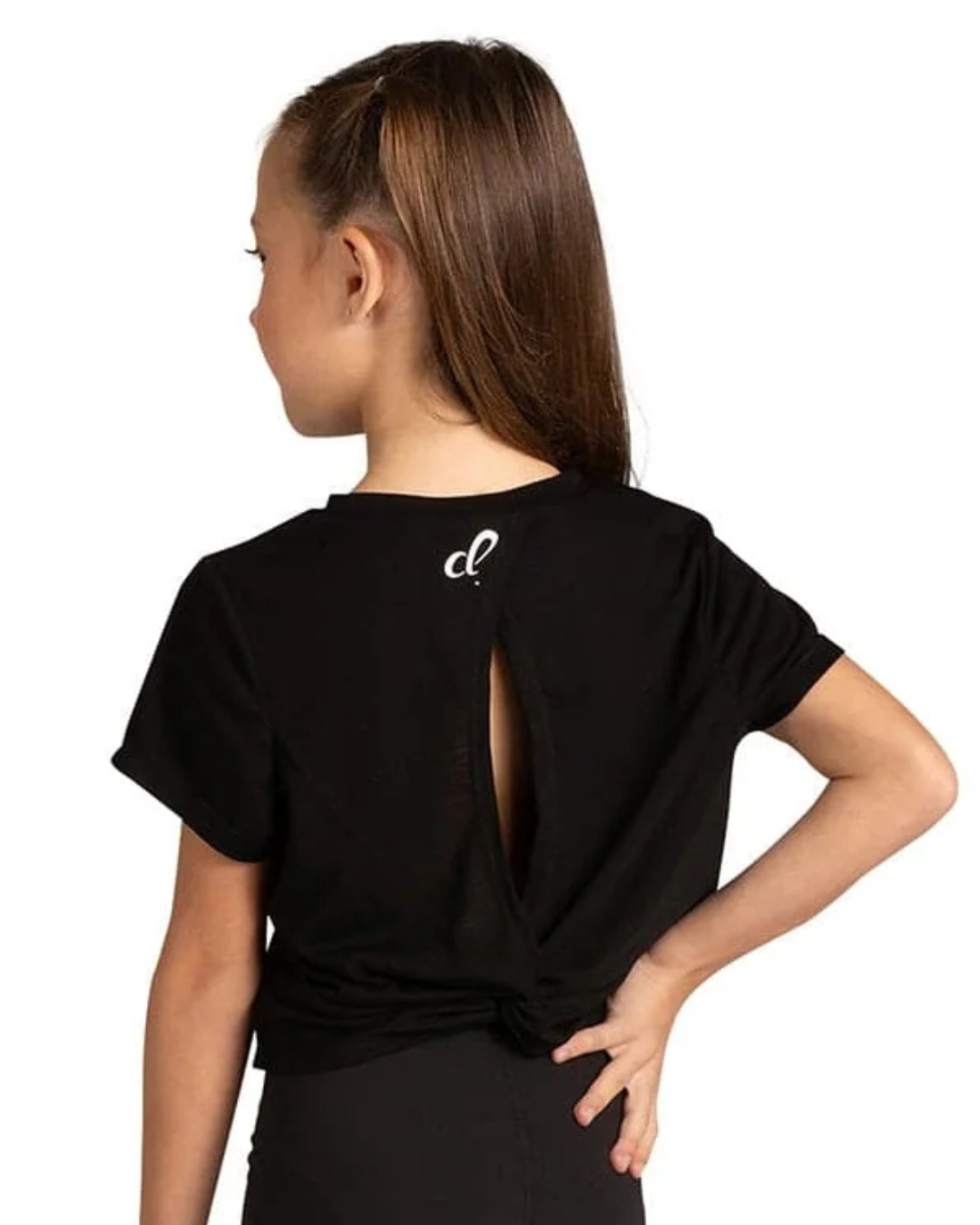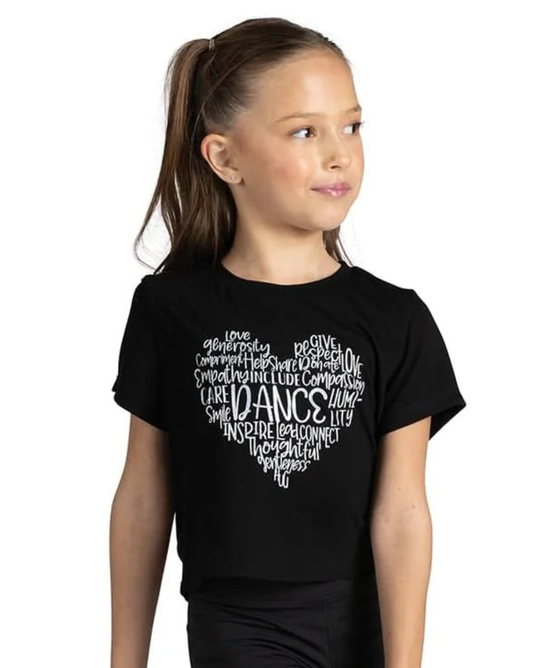 Dance expressions tee! Semi-fitted crop length tee with twist back detail and contrast white screen print that features words attributed to an all-around good dancer. Printed on soft and comfortable t-shirt fabric.