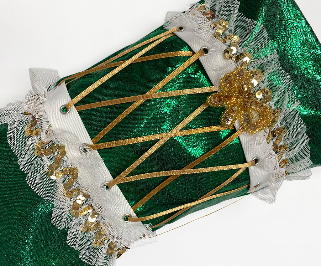 AWESOME GIFT for your current or future musician. Quality made fully lined shinny green mystique stocking with lacy drum details and gold sequin bow. Fill with fun items for a special girl or boy on your list.