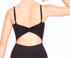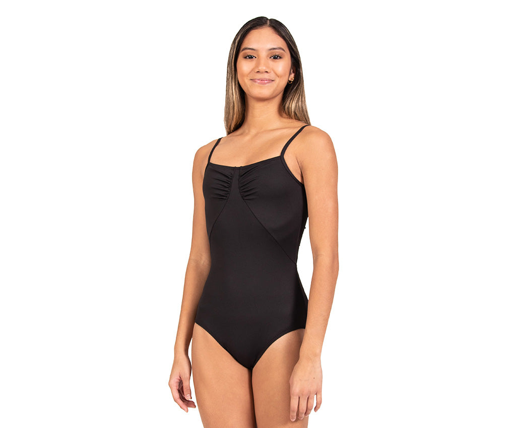 This Bodywrappers camisole leotard has a sweatheart neckline with a gathered bodice front. wide open neckline with matching binding trim. Lower back includes a gathered center bow. Comes with adjustable/convertable straps. Memory Stretch front lining.