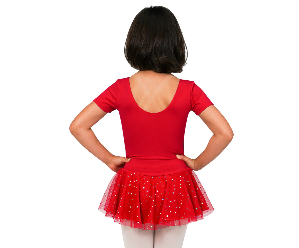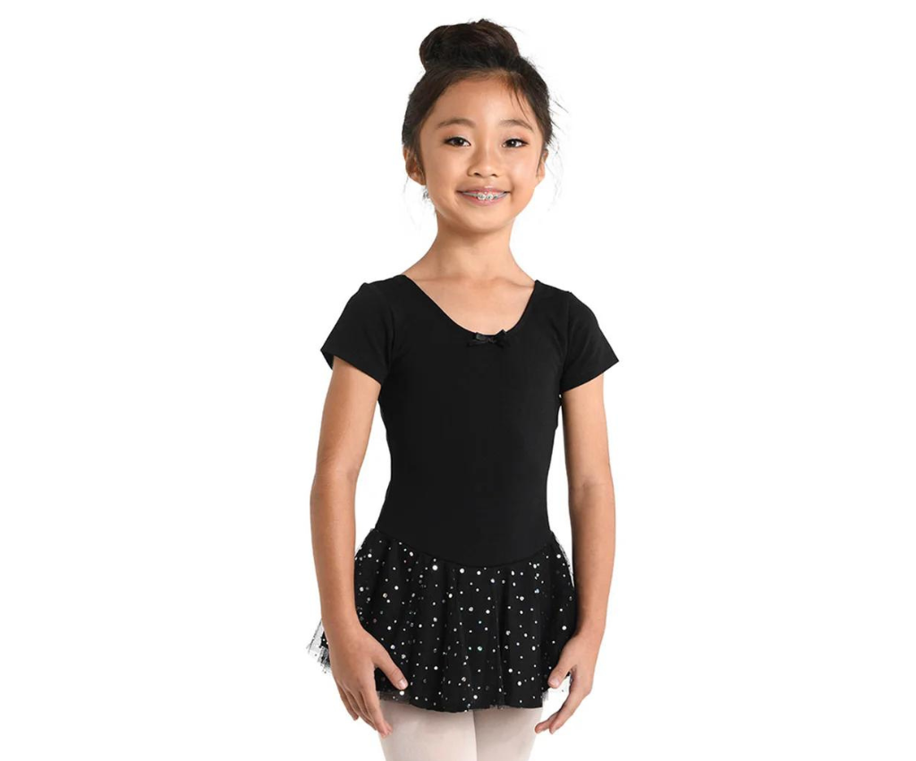 Danznmotion's short sleeve glitter dress features double layer skirt with sparkling hologram dots on mesh top layer and a solid georgette underlay. Fully front lined made from a cotton blend.