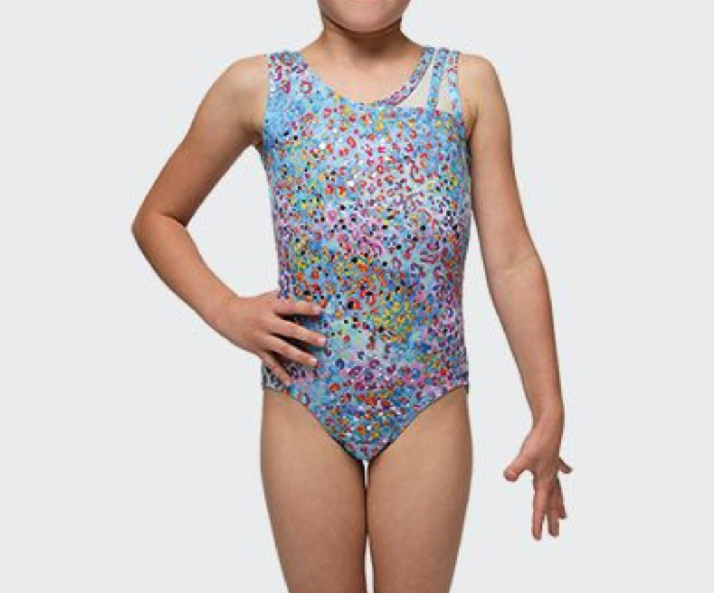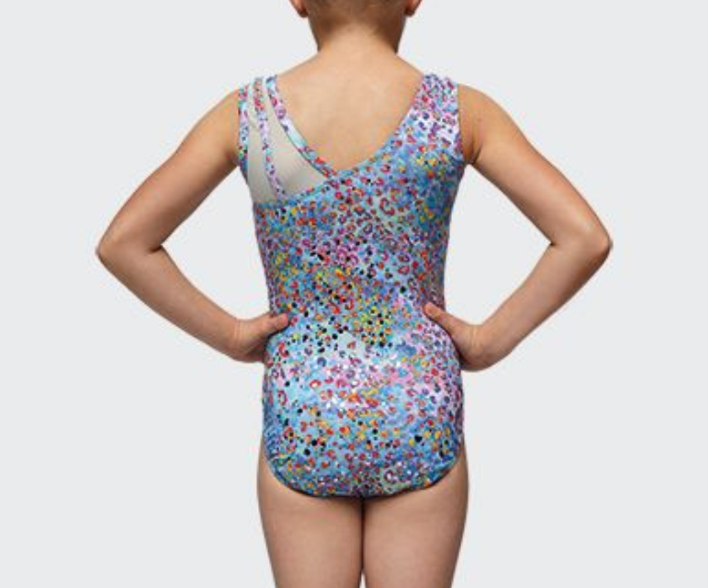 This Mondor printed gymnastic leotard has a combination of solid and printed metallic fabrics in fun colours. Basic tank style shoulder with a scoop neckline and a regular cut leg line. One mesh shoulder strap. Sorbtek gusset lining.