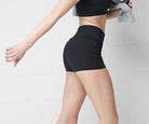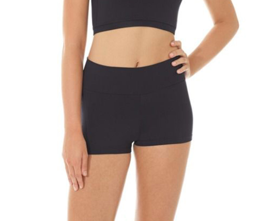 Basic black booty short with a shorter 1 3/4" inseam, made in Mondor's Matrix fabric. Features a soft fabric waistband. Essential for dance class and convention.