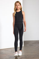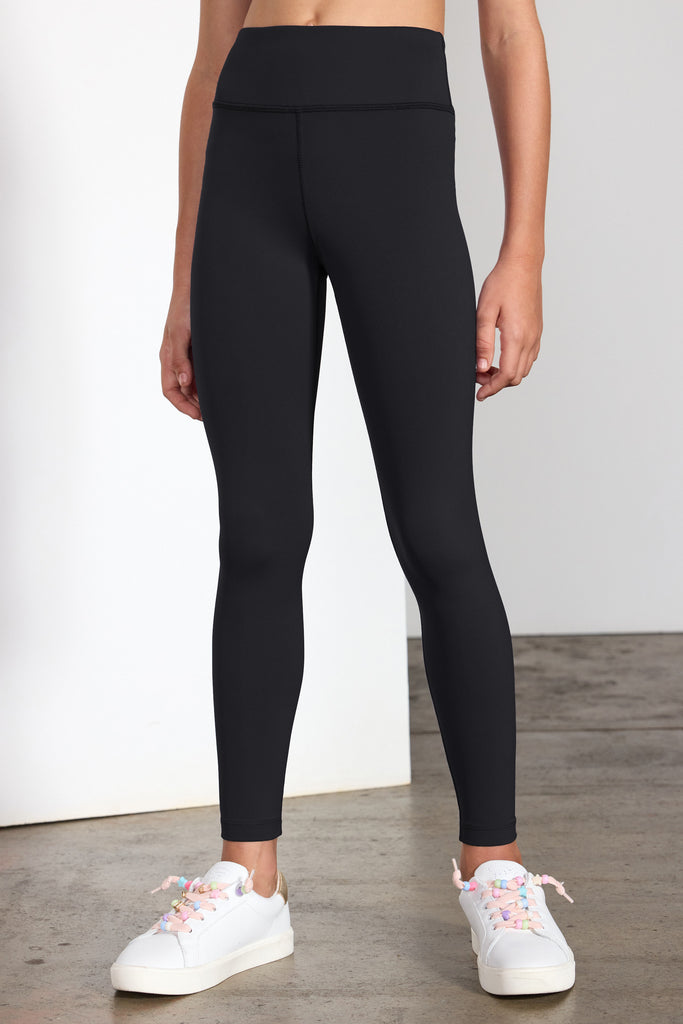 These MPG Play Girl's High Rise Leggings are responsibility made with a recycled polyester material that is moisture wicking and offers some compression. They have a 23" inseam and feature 4 way stretch, a high waist, anti chafing stitching, and clean lines.
