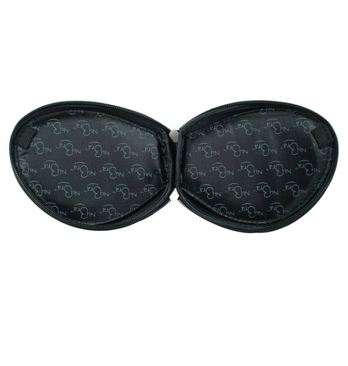 Discreet, durable nylon case with zipper closure. Internal divider keeps bra cups from sticking to each other. Fits silicone A to C cups.