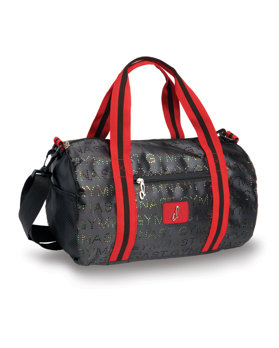 This Danznmotion nylon duffle features with the word “GYMNAST” punched out to an eye catching glitter foil background. Red stripe double handles and adjustable shoulder strap offer versatile carrying options. Large fully lined inner compartment that zips closed plus two mesh exterior side pockets and a front zipper pocket makes for an awesome looking and very practical bag. Wipes clean and folds flat.