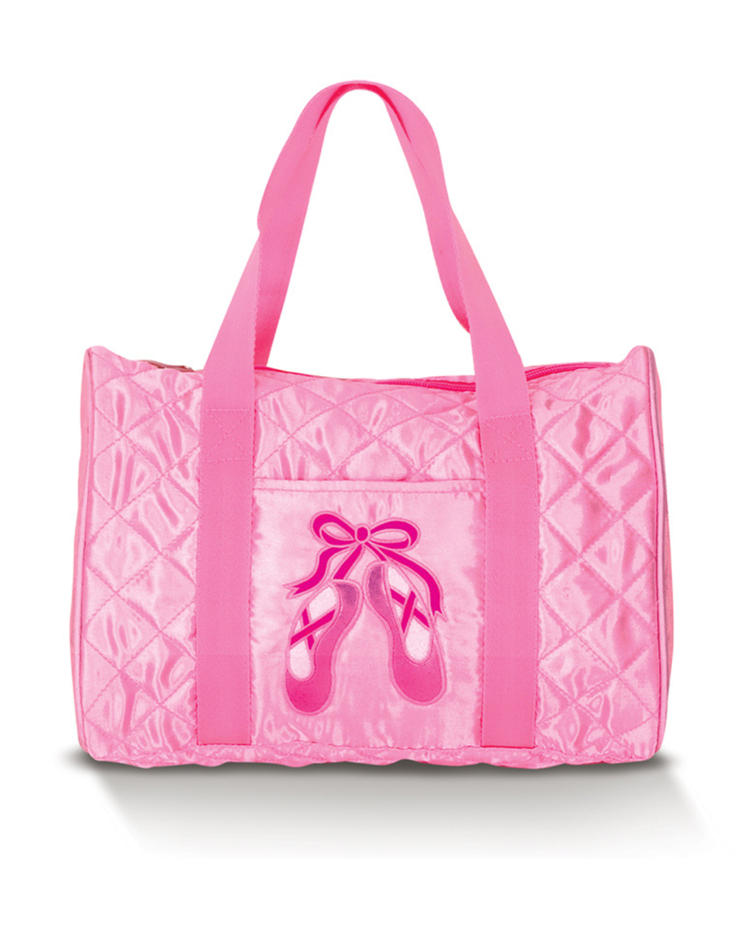 This Danznmotion quilted diamond pattern satin duffel with contrasting pink stitch. Features an embroidered toe shoe design on front pocket. Zipper closure and fully lined interior includes three pockets. Perfect for the new ballerina.