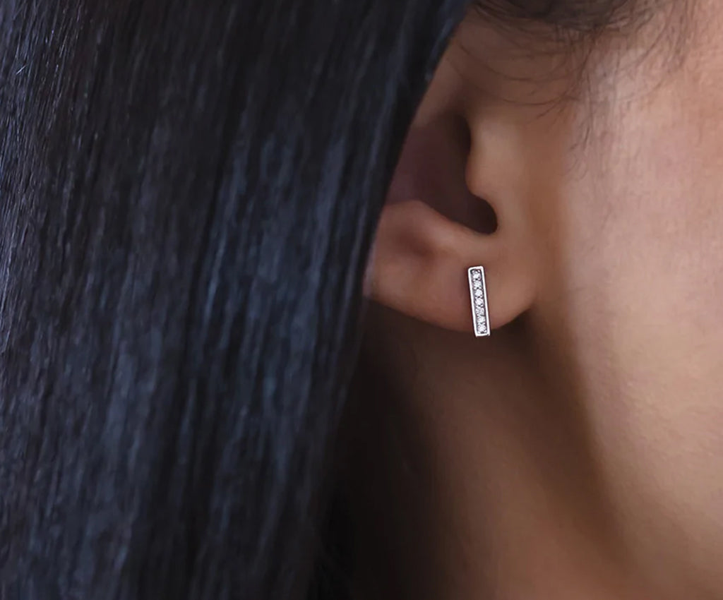 Inspired by the sleek edges of the barre, with a little extra added sparkle. The At The Barre Signature earrings make a statement everywhere they go. A line of faceted cubics sparkle against the graphic sheen of sterling silver, making a stylishly bold statement for any occasion. Great for dancers or non-dancers alike.