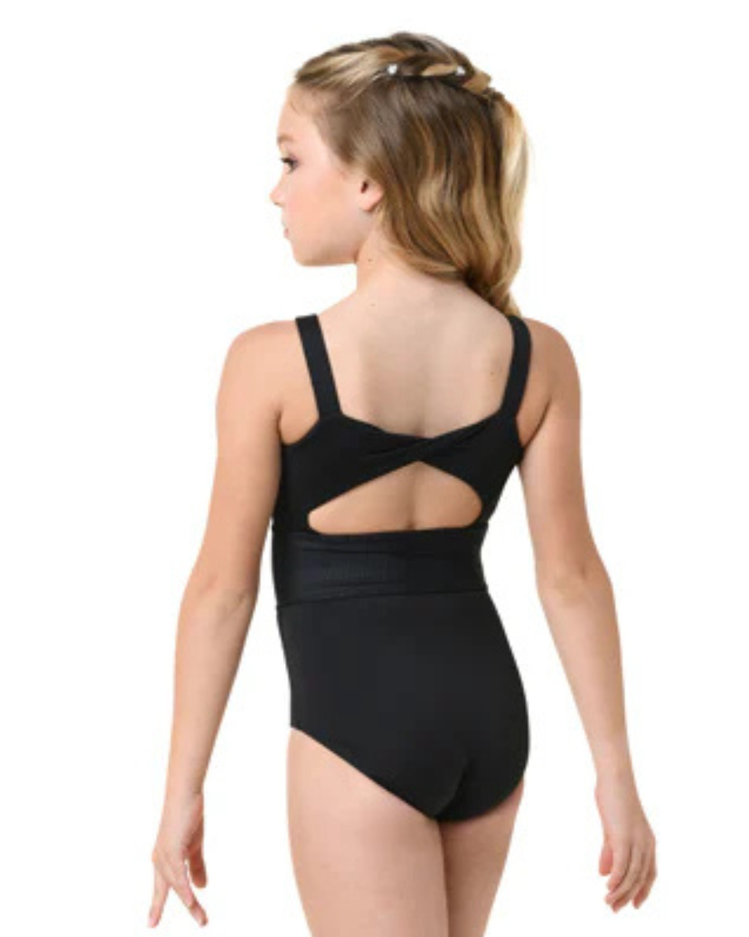 The Danznmotion Riley camisole style leotard has a pinch front neck, mesh side inserts, rib contrast waist insert, and fun back twist detail. Great leotard for dance! Perfect for class, convention or photoshoots. Children's sizes have a fully lined front. Ladies' sizes have a shelf bra with removable cups.