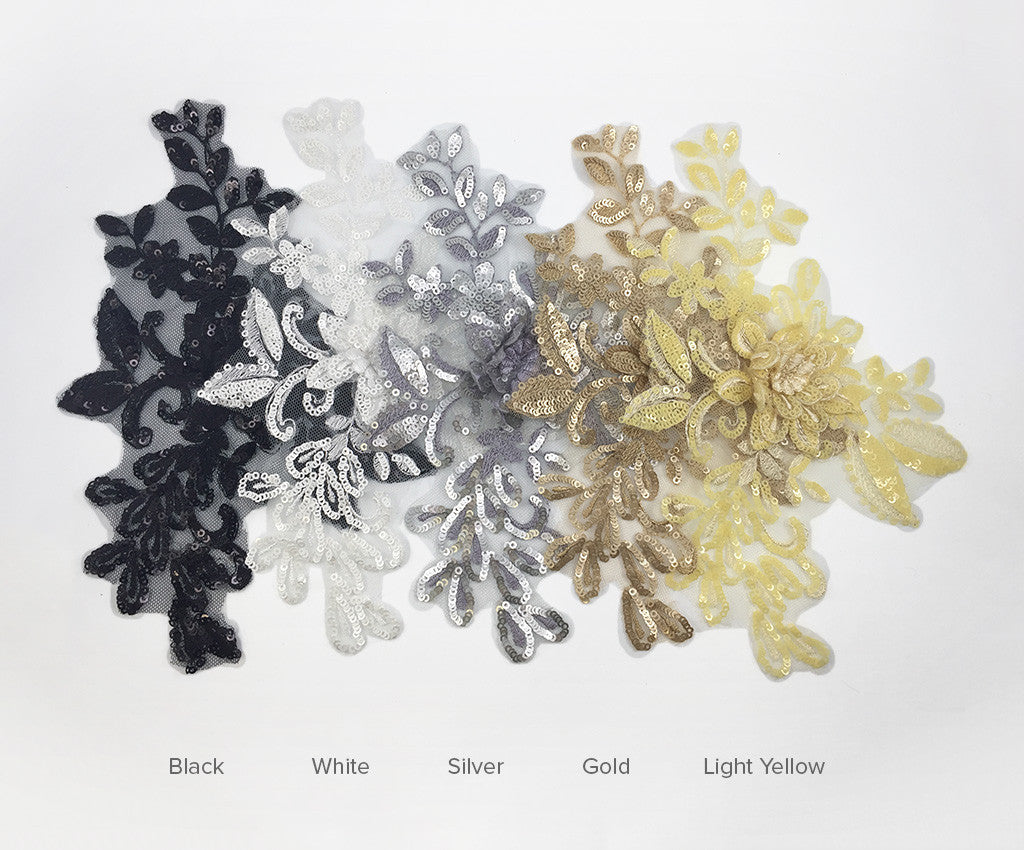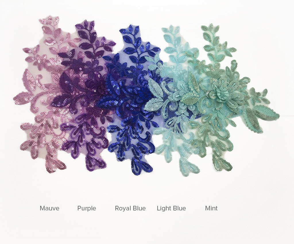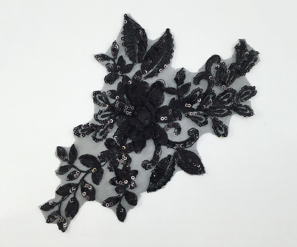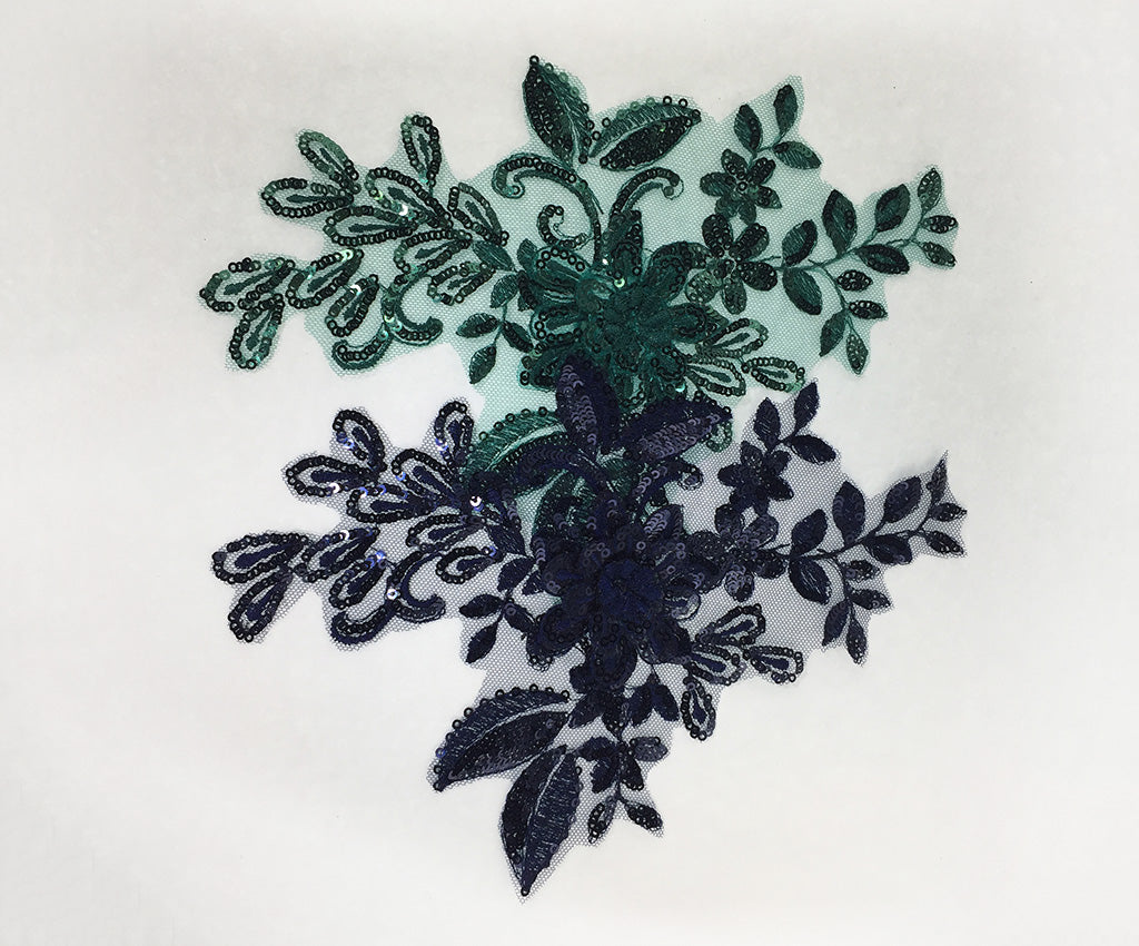 Mesh backed lace appliques have a 3 dimensional sequin & satin finished flower surrounded by sequin and satin leaf details.  Many colours include shaded details as well.  Comes in a wide assortment of colours.  Approximately 9 1/2 X 6 1/2 inches each.  Sold as a single piece.  Professionally packaged to protect product during shipping.