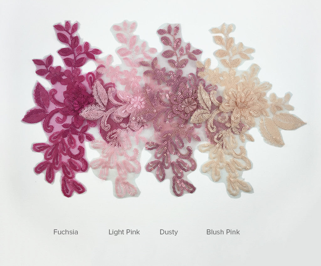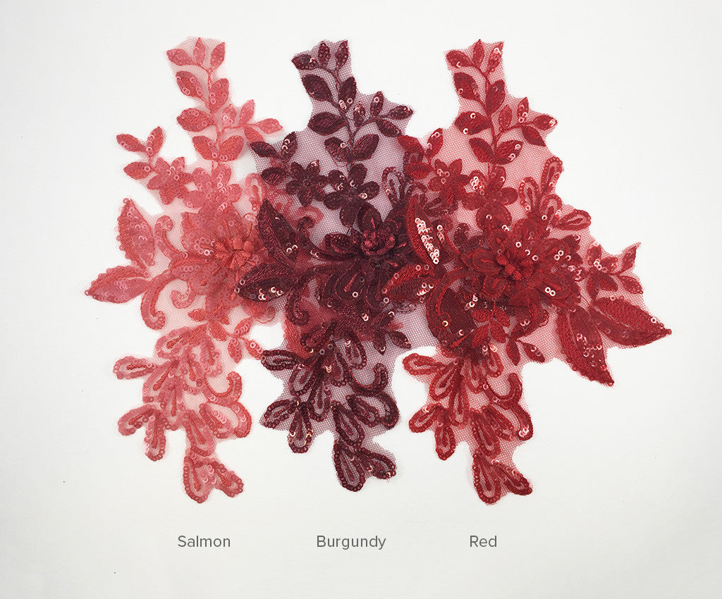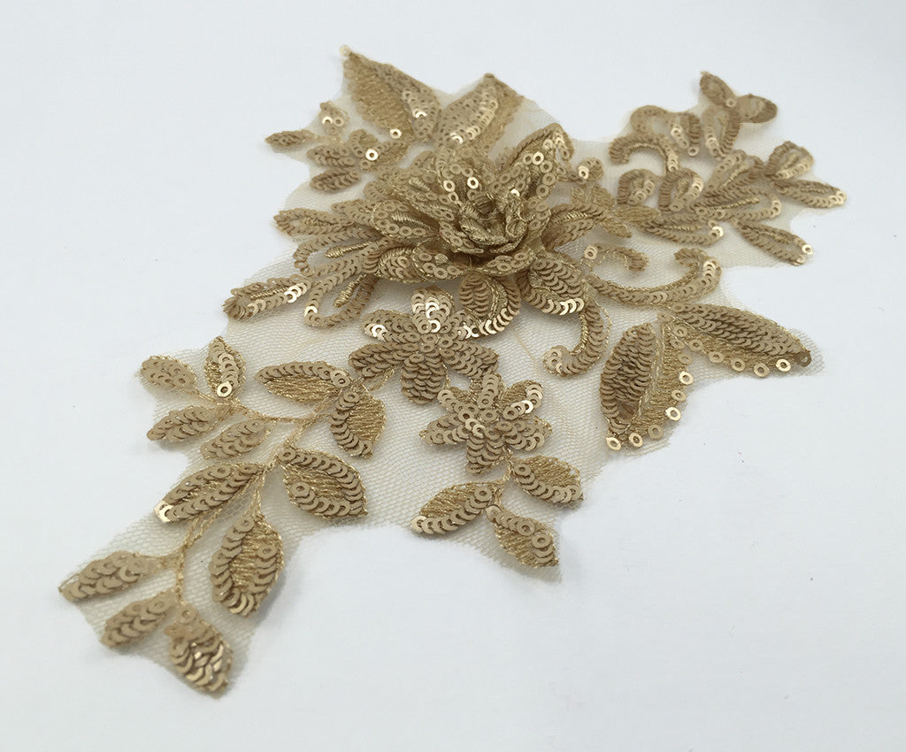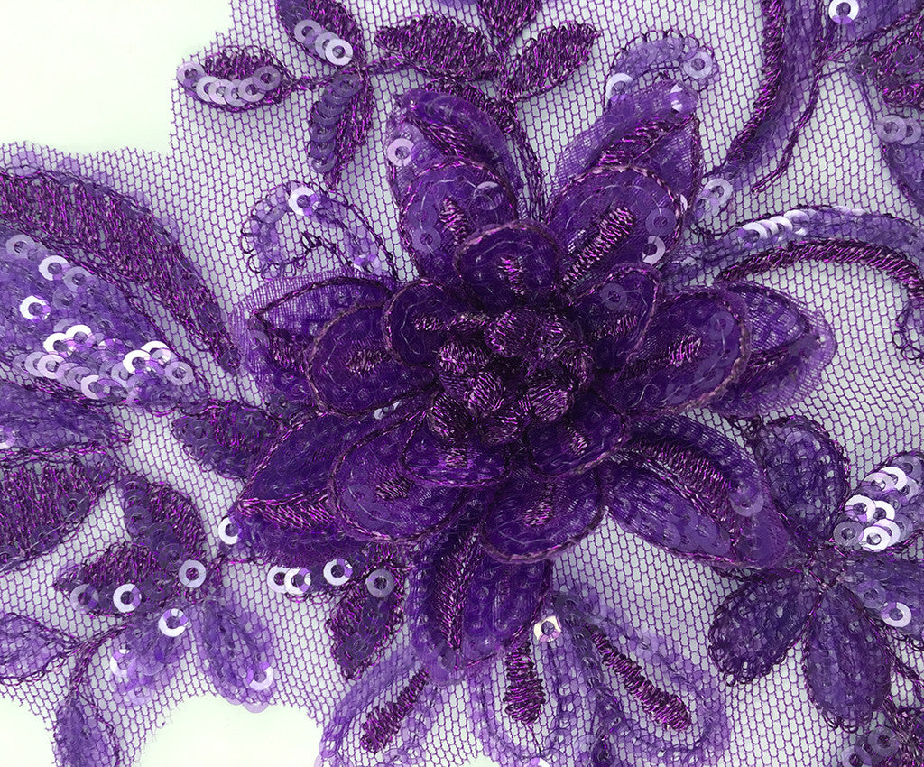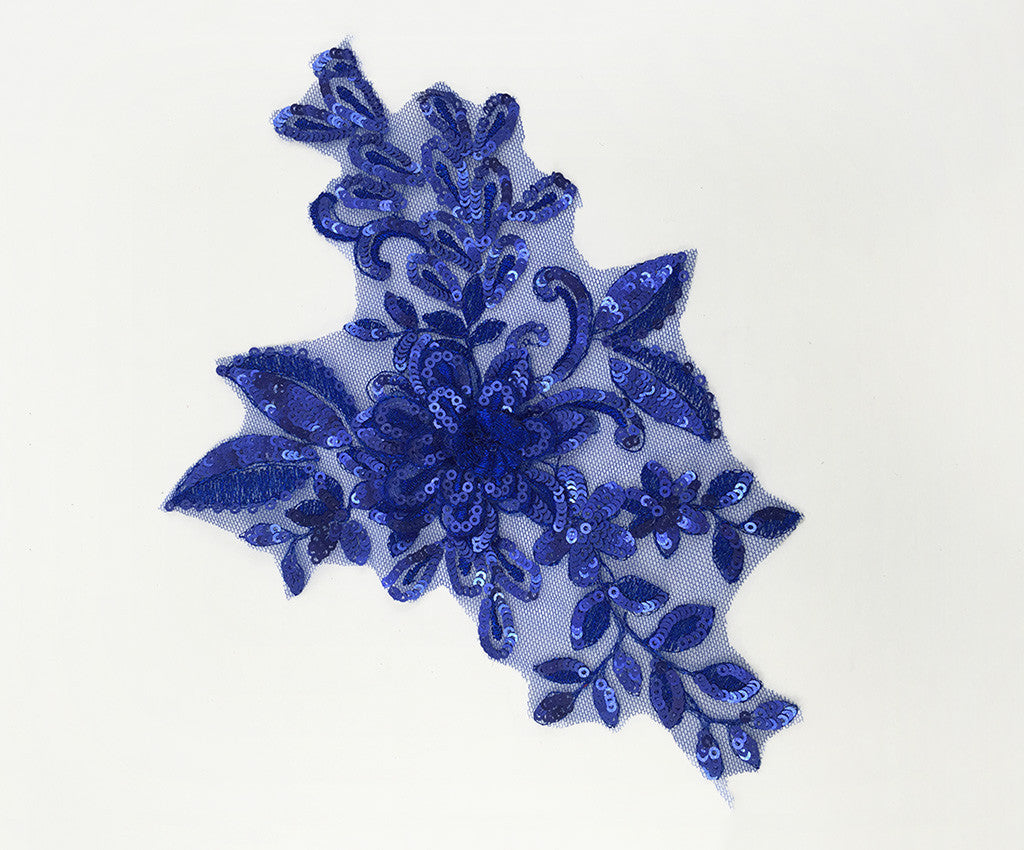 Mesh backed lace appliques have a 3 dimensional sequin & satin finished flower surrounded by sequin and satin leaf details.  Many colours include shaded details as well.  Comes in a wide assortment of colours.  Approximately 9 1/2 X 6 1/2 inches each.  Sold as a single piece.  Professionally packaged to protect product during shipping.
