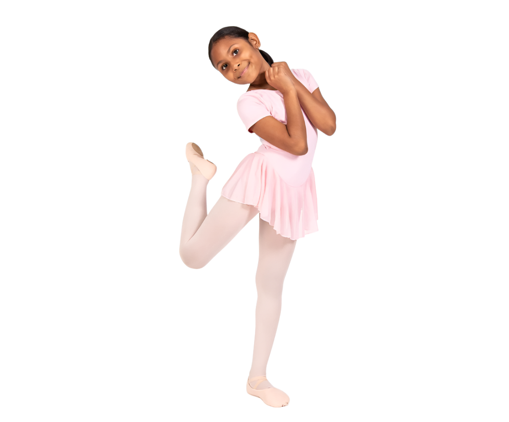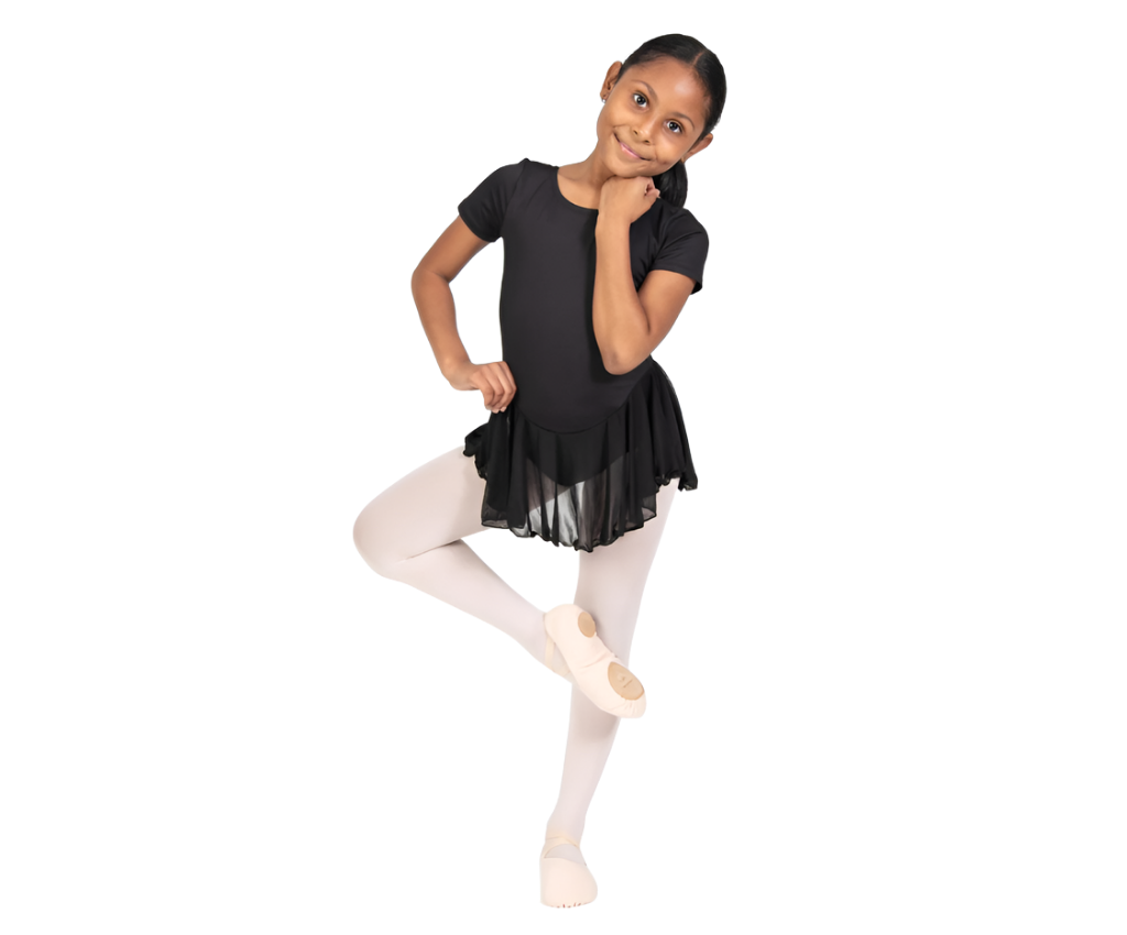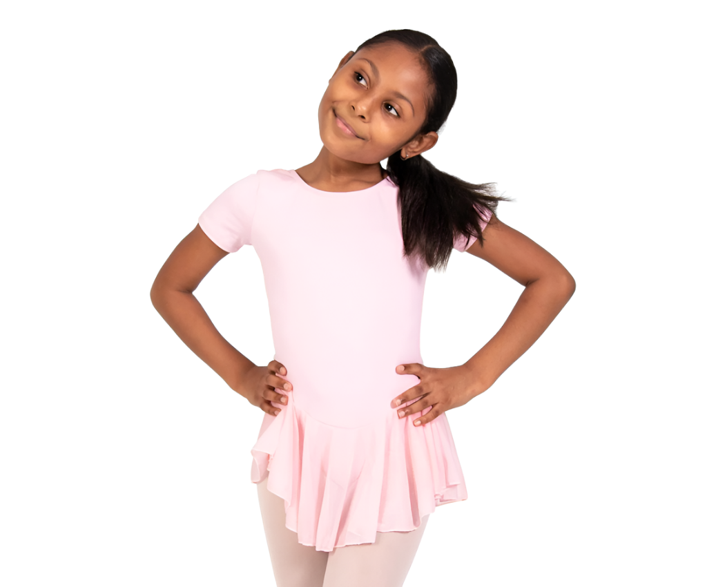 Sort sleeve chiffon skirted leotard features a memorySTRETCH front bodice lining and a flowing chiffon skirt.